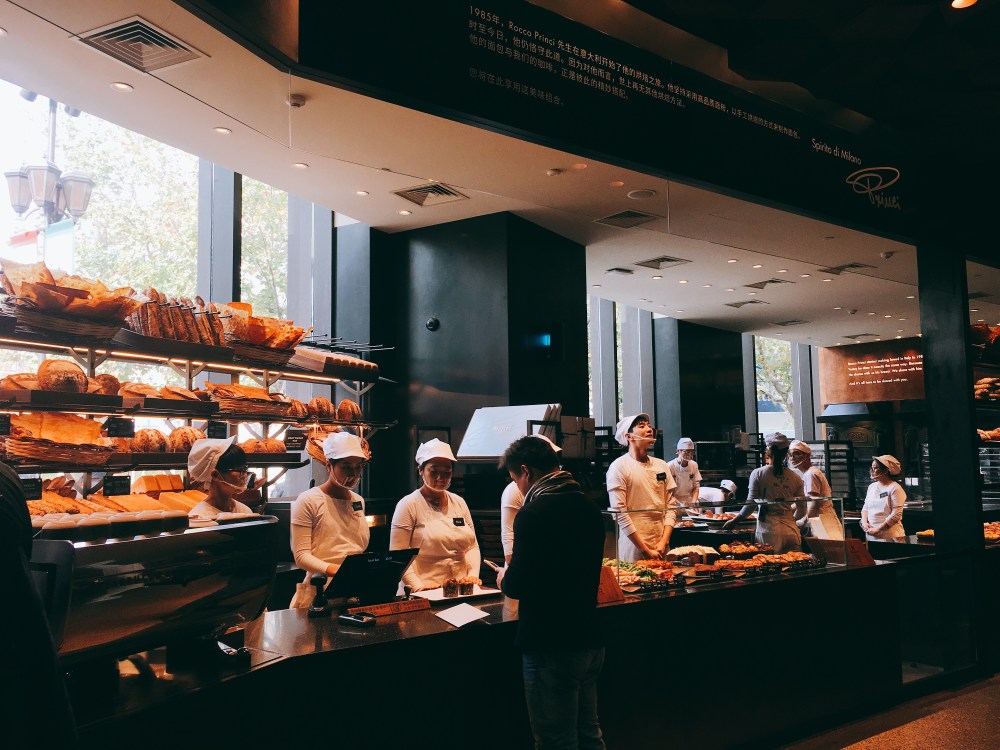 一进去,左手边入眼的画面,就是一群热情澎湃的面包师傅在跟你打招呼,整齐的制服与简洁的画面,使你第一个感觉就是“温馨与舒服”
