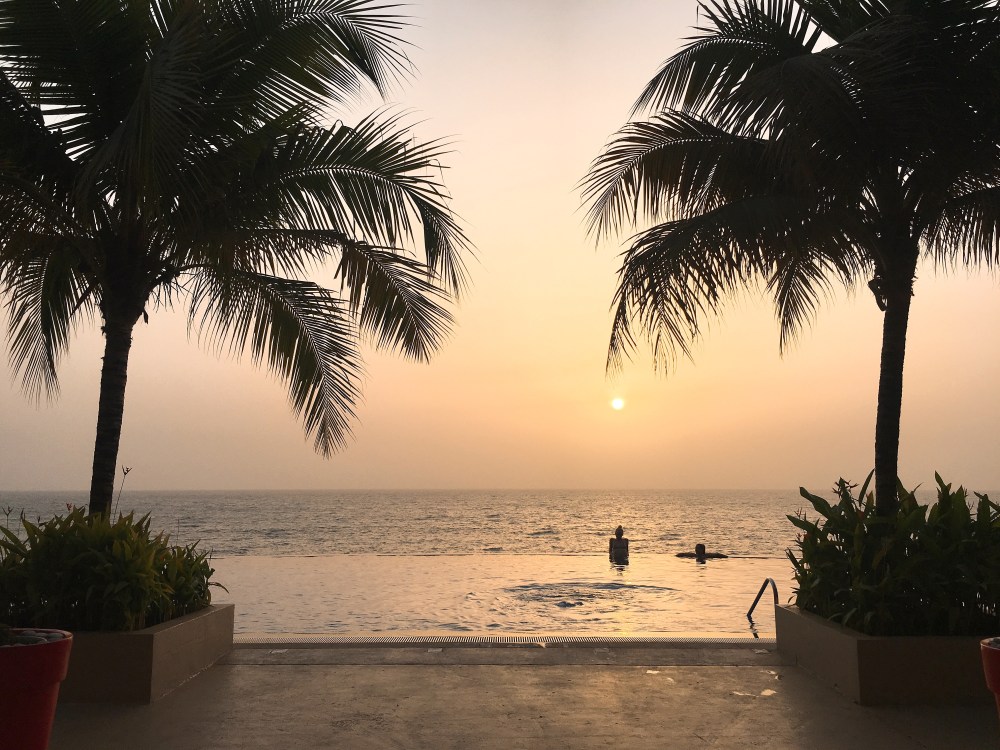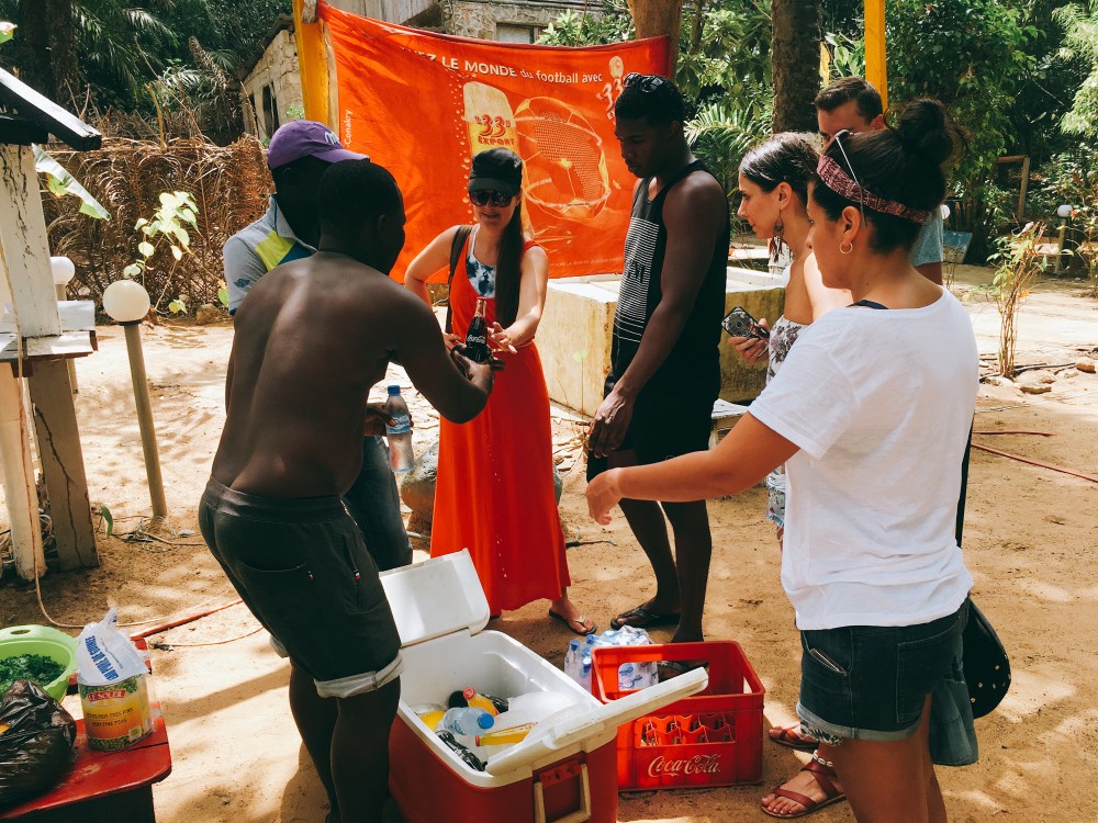佩服啊~我可是全程就离不开那用了20000几内亚法郎(大伞),15000几内亚法郎租来的毯子下,还拼命涂防嗮防嗮防嗮。有时候跟一群同事出去还是很好玩的~每个都是阳光小孩,热爱阳光沙滩很开心跟这群意大利,马耳他,巴西等等国家的同事们一起出游~好的同事跟旅伴有时候还真的是可遇不可求 #感恩老外跟包子的分别 哈哈哈 爆嗮几个小时都不怕黑还要继续爆嗮的美眉,反而我就继续在那岛屿买了布把自己完整的包着由于妹子要买东西,导游就停下一旁便利店给我们进去买买东西。而为了节省电源,中午的便利店可是没有开灯,没有冷气的~回到了酒店,同事们继续游泳~他们在泳池里观赏美丽的夕阳下,而我是在酒店的阳台上享受我的晚餐之余一边观赏美景