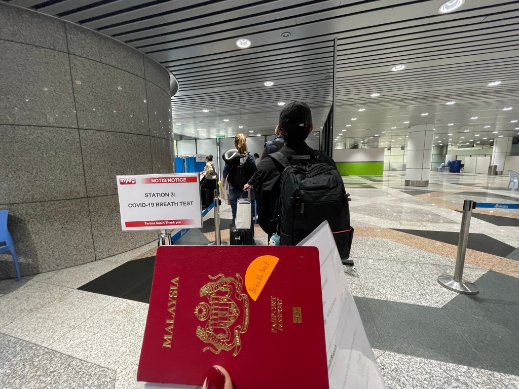 排队报到给护照贴上贴纸再去排队做Test。得过Covid的人只需要做Breath Test (第一次在马来西亚看见)是我孤陋寡闻了